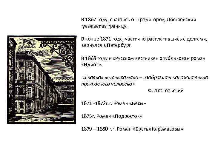 В 1867 году, спасаясь от кредиторов, Достоевский уезжает за границу. В конце 1871 года, частично расплатившись с долгами, вернулся в Петербург. В 1868 году в «Русском вестнике» опубликован роман «Идиот» . «Главная мысль романа – изобразить положительно прекрасного человека» Ф. Достоевский 1871 -1872 г. г. Роман «Бесы» 1875 г. Роман «Подросток» 1879 – 1880 г. г. Роман «Братья Карамазовы»