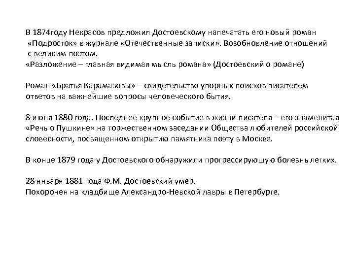 В 1874 году Некрасов предложил Достоевскому напечатать его новый роман «Подросток» в журнале «Отечественные записки» . Возобновление отношений с великим поэтом. «Разложение – главная видимая мысль романа» (Достоевский о романе) Роман «Братья Карамазовы» – свидетельство упорных поисков писателем ответов на важнейшие вопросы человеческого бытия. 8 июня 1880 года. Последнее крупное событие в жизни писателя – его знаменитая «Речь о Пушкине» на торжественном заседании Общества любителей российской словесности, посвященном открытию памятника поэту в Москве. В конце 1879 года у Достоевского обнаружили прогрессирующую болезнь легких. 28 января 1881 года Ф. М. Достоевский умер. Похоронен на кладбище Александро-Невской лавры в Петербурге.