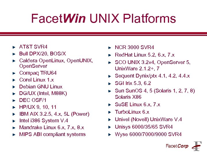 Facet. Win UNIX Platforms AT&T SVR 4 Bull DPX/20, BOS/X Caldera Open. Linux, Open. UNIX, Open. Server Compaq TRU 64 Corel Linux 1. x Debian GNU Linux DG/UX (Intel, M 88 K) DEC OSF/1 HP/UX 9, 10, 11 IBM AIX 3. 2. 5, 4. x, 5 L (Power) Intel i 386 System V. 4 Mandrake Linux 6. x, 7. x, 8. x MIPS ABI compliant systems NCR 3000 SVR 4 Red. Hat Linux 5. 2, 6. x, 7. x SCO UNIX 3. 2 v 4, Open. Server 5, Unix. Ware 2. 1. 2+, 7 Sequent Dynix/ptx 4. 1, 4. 2, 4. 4. x SGI Irix 5. 3, 6. 2 Sun. OS 4, 5 (Solaris 1, 2, 7, 8) Solaris X 86 Su. SE Linux 6. x, 7. x Turbo. Linux 6. x Univel (Novell) Unix. Ware V. 4 Unisys 6000/35/65 SVR 4 Wyse 6000/7000/9000 SVR 4