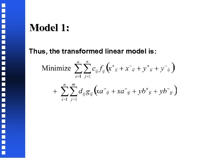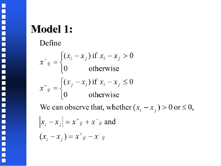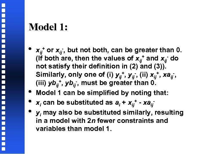 Model 1: • • xij+ or xij-, but not both, can be greater than 0. (If both are, then the values of xij+ and xij- do not satisfy their definition in (2) and (3)). Similarly, only one of (i) yij+, yij-, (ii) xij+, xaij-, (iii) ybij+, ybij-, must be greater than 0. Model 1 can be simplified by noting that: xi can be substituted as ai + xij+ - xaijyi may also be substituted similarly, resulting in a model with 2 n fewer constraints and variables than model 1.