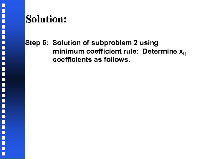 Solution: Step 6: Solution of subproblem 2 using minimum coefficient rule: Determine xij coefficients as follows.