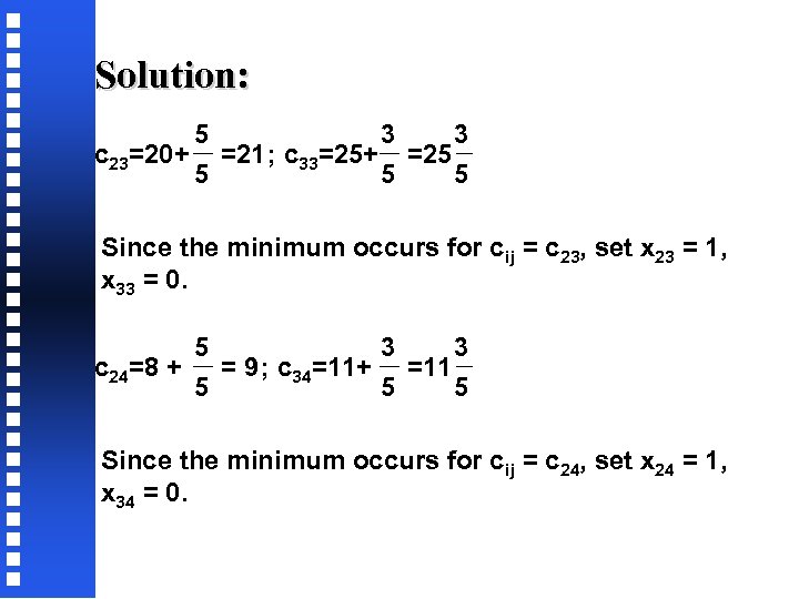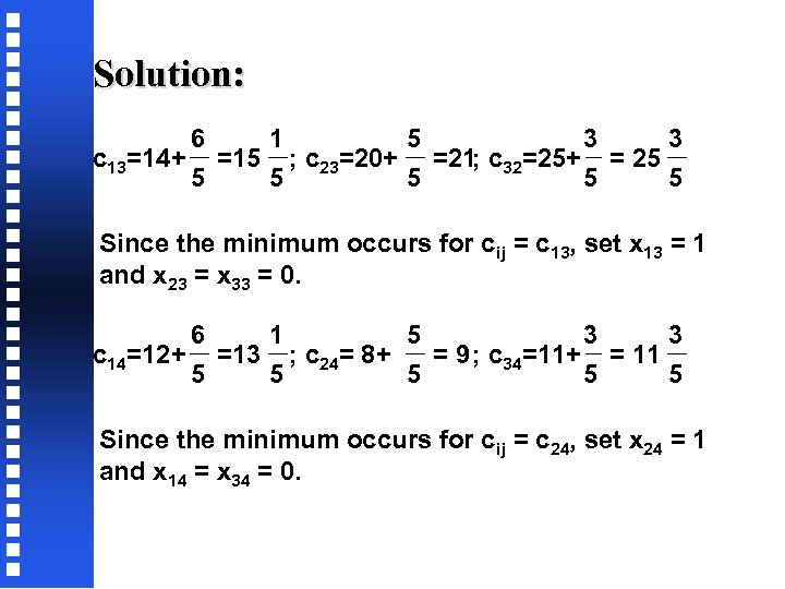 Solution: 5 3 3 c 23=20+ =21 ; c 33=25+ =25 5 Since the minimum occurs for cij = c 23, set x 23 = 1, x 33 = 0. 5 3 3 c 24=8 + = 9 ; c 34=11+ =11 5 5 5 Since the minimum occurs for cij = c 24, set x 24 = 1, x 34 = 0.