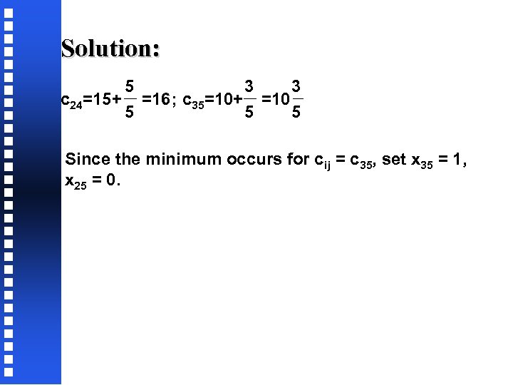 Solution: 5 3 3 c 24=15+ =16 ; c 35=10+ =10 5 5 5 Since the minimum occurs for cij = c 35, set x 35 = 1, x 25 = 0.