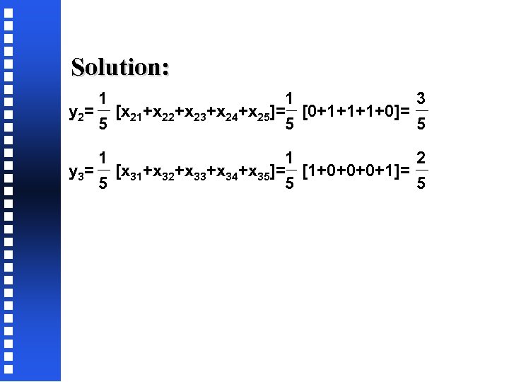 Solution: 1 1 3 y 2= [x 21+x 22+x 23+x 24+x 25]= [0+1+1+1+0]= 5 5 5 1 1 2 y 3= [x 31+x 32+x 33+x 34+x 35]= [1+0+0+0+1]= 5 5 5
