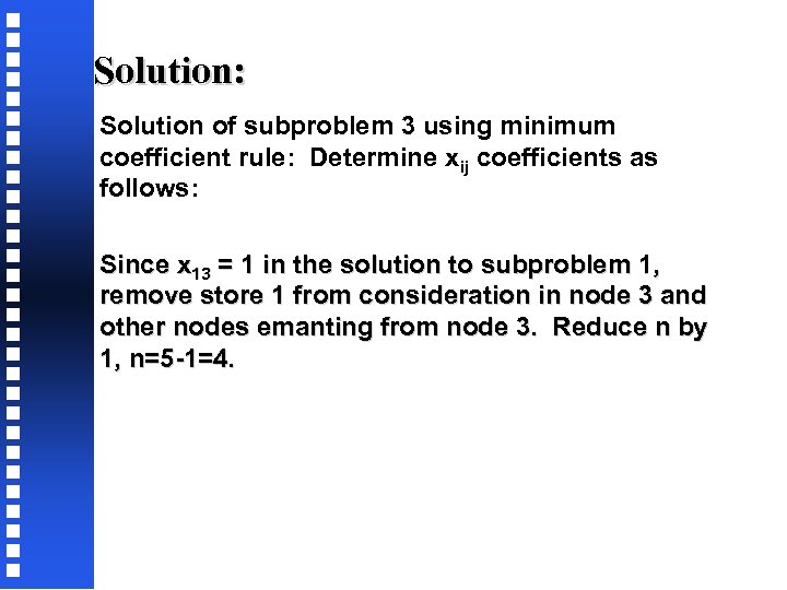 Solution: Solution of subproblem 3 using minimum coefficient rule: Determine xij coefficients as follows: Since x 13 = 1 in the solution to subproblem 1, remove store 1 from consideration in node 3 and other nodes emanting from node 3. Reduce n by 1, n=5 -1=4.