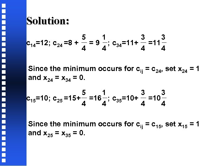 Solution: 5 1 3 3 c 14=12; c 24 =8 + = 9 ; c 34=11+ =11 4 4 Since the minimum occurs for cij = c 24, set x 24 = 1 and x 24 = x 34 = 0. 5 1 3 3 c 15=10; c 25 =15+ =16 ; c 35=10+ =10 4 4 Since the minimum occurs for cij = c 15, set x 15 = 1 and x 25 = x 35 = 0.