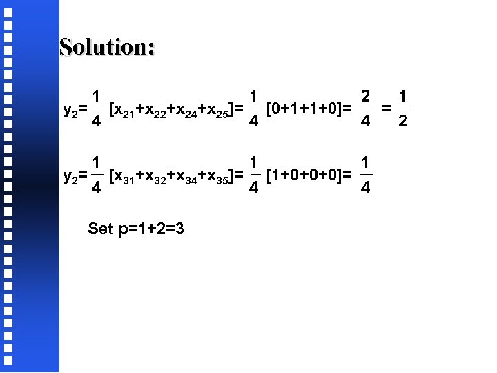 Solution: 1 1 2 1 y 2= [x 21+x 22+x 24+x 25]= [0+1+1+0]= = 4 4 4 2 1 1 1 y 2= [x 31+x 32+x 34+x 35]= [1+0+0+0]= 4 4 4 Set p=1+2=3