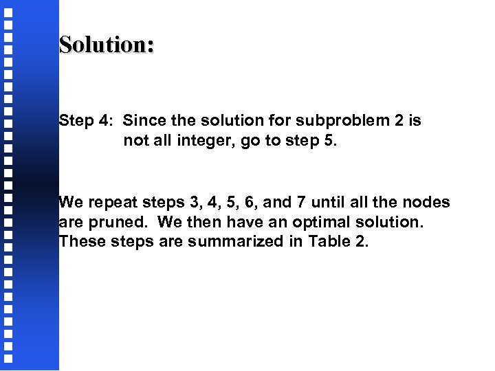 Solution: Step 4: Since the solution for subproblem 2 is not all integer, go to step 5. We repeat steps 3, 4, 5, 6, and 7 until all the nodes are pruned. We then have an optimal solution. These steps are summarized in Table 2.