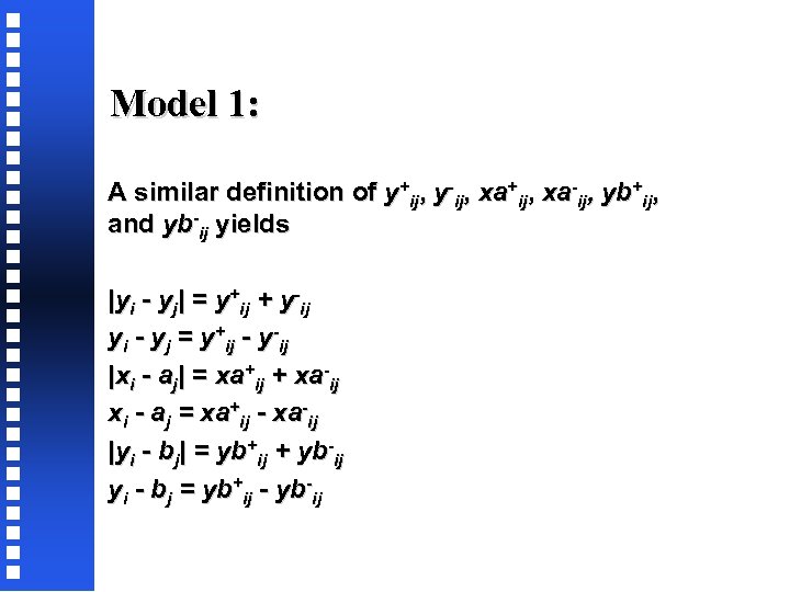 Model 1: A similar definition of y+ij, y-ij, xa+ij, xa-ij, yb+ij, and yb-ij yields |yi - yj| = y+ij + y-ij yi - yj = y+ij - y-ij |xi - aj| = xa+ij + xa-ij xi - aj = xa+ij - xa-ij |yi - bj| = yb+ij + yb-ij yi - bj = yb+ij - yb-ij
