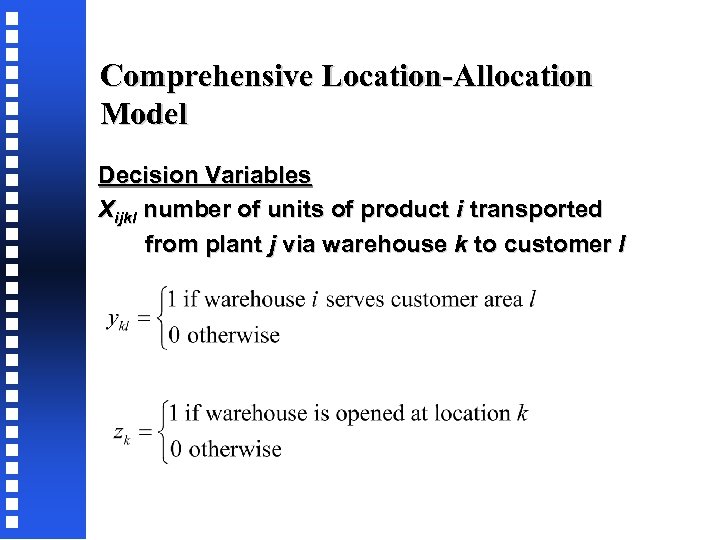 Comprehensive Location-Allocation Model Parameters Sij production capacity of product i at plant j Dil demand for product i at customer zone l Fk fixed cost of operating warehouse k Vik unit variable cost of handling product i at warehouse k Cijkl average unit cost of producing and transporting product i from plant j via warehouse k to customer l UCk Upper bound on the capacity of warehouse k LCk Lower bound on the capacity of warehouse k