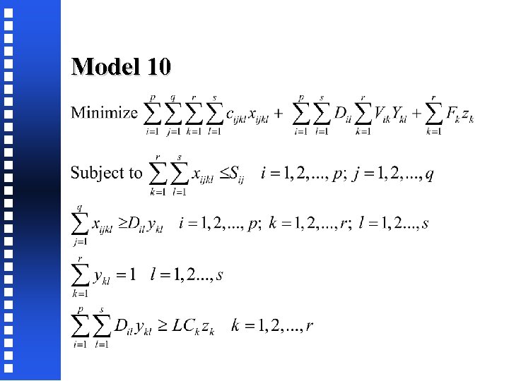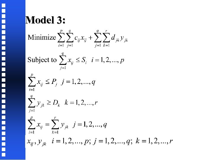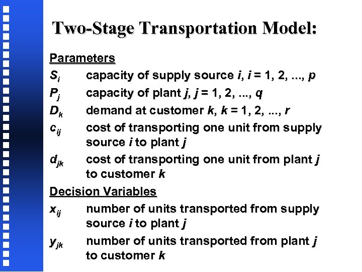 Two-Stage Transportation Model: Parameters Si capacity of supply source i, i = 1, 2, . . . , p Pj capacity of plant j, j = 1, 2, . . . , q Dk demand at customer k, k = 1, 2, . . . , r cij cost of transporting one unit from supply source i to plant j djk cost of transporting one unit from plant j to customer k Decision Variables xij number of units transported from supply source i to plant j yjk number of units transported from plant j to customer k