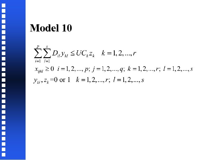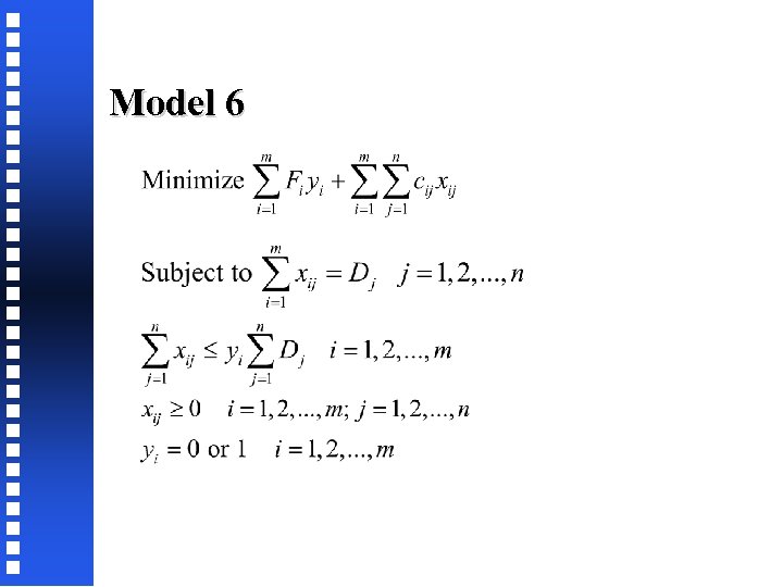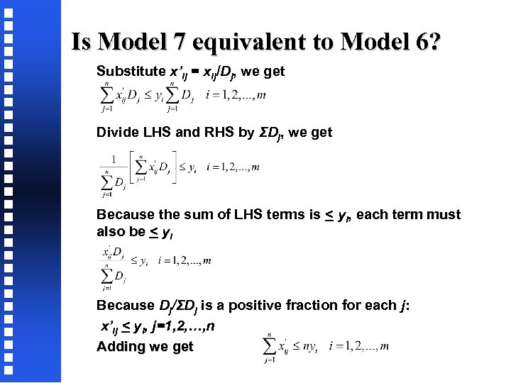 Is Model 7 equivalent to Model 6? Substitute x’ij = xij/Dj, we get Divide LHS and RHS by ΣDj, we get Because the sum of LHS terms is < yi, each term must also be < yi Because Dj/ΣDj is a positive fraction for each j: x’ij < yi, j=1, 2, …, n Adding we get