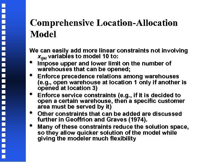 Comprehensive Location-Allocation Model We can easily add more linear constraints not involving xijkl variables to model 10 to: • Impose upper and lower limit on the number of warehouses that can be opened; • Enforce precedence relations among warehouses (e. g. , open warehouse at location 1 only if another is opened at location 3) • Enforce service constraints (e. g. , if it is decided to open a certain warehouse, then a specific customer area must be served by it) • Other constraints that can be added are discussed further in Geoffrion and Graves (1974). • Many of these constraints reduce the solution space, so they allow quicker solution of the model while giving the modeler much flexibility