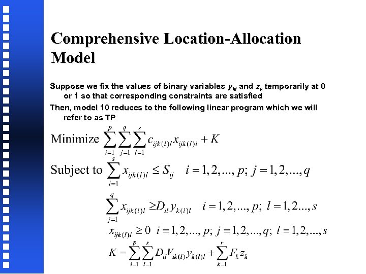 Comprehensive Location-Allocation Model Suppose we fix the values of binary variables ykl and zk temporarily at 0 or 1 so that corresponding constraints are satisfied Then, model 10 reduces to the following linear program which we will refer to as TP
