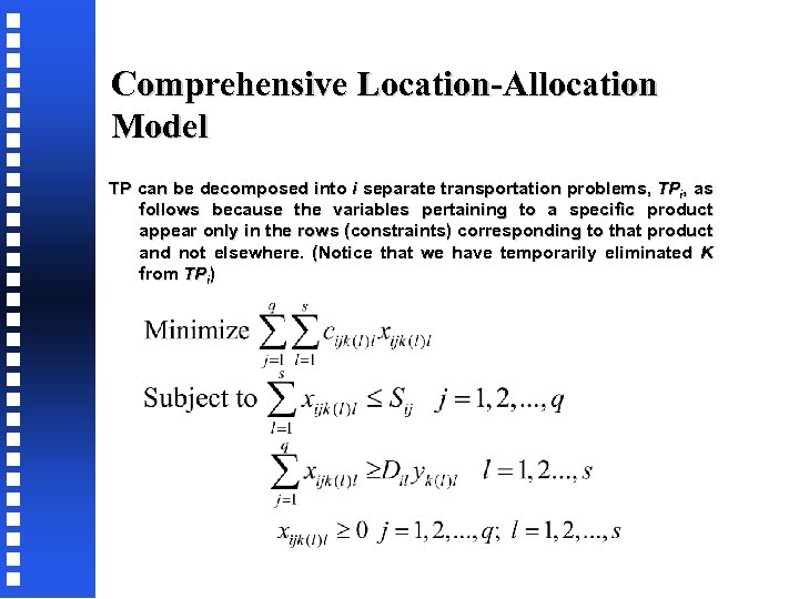 Comprehensive Location-Allocation Model TP can be decomposed into i separate transportation problems, TPi, as follows because the variables pertaining to a specific product appear only in the rows (constraints) corresponding to that product and not elsewhere. (Notice that we have temporarily eliminated K from TPi)