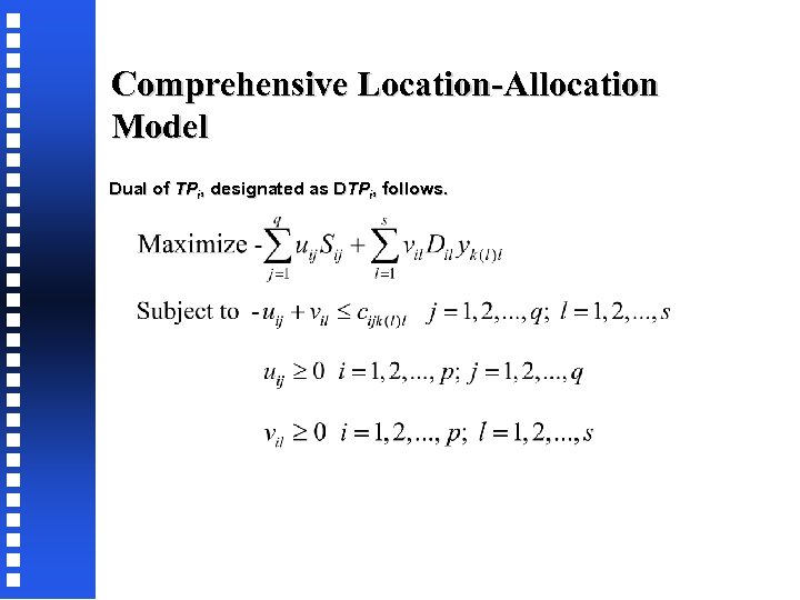 Comprehensive Location-Allocation Model Dual of TPi, designated as DTPi, follows.