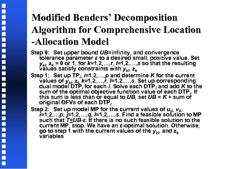 Modified Benders’ Decomposition Algorithm for Comprehensive Location -Allocation Model Step 0: Set upper bound UB=infinity, and convergence tolerance parameter ε to a desired small, positive value. Set ykl, zk = 0 or 1, for k=1, 2, …, r, l=1, 2, …, s so that the resulting values satisfy constraints with ykl, zk Step 1: Set up TPi, i=1, 2, …, p and determine K for the current values of ykl, zk k=1, 2, …, r, l=1, 2, …, s. Set up corresponding dual model DTPi for each i. Solve each DTPi and add K to the sum of the optimal objective function value of each DTPi. If this sum is less than or equal to UB, set UB = K + sum of original OFVs of each DTPi Step 2: Set up model MP for the current values of uij, vil, i=1, 2, …p; j=1, 2, …, q, l=1, 2, …, s. Find a feasible solution to MP such that T
