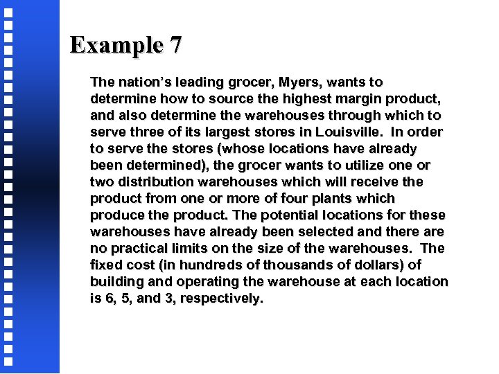 Example 7 The nation’s leading grocer, Myers, wants to determine how to source the highest margin product, and also determine the warehouses through which to serve three of its largest stores in Louisville. In order to serve the stores (whose locations have already been determined), the grocer wants to utilize one or two distribution warehouses which will receive the product from one or more of four plants which produce the product. The potential locations for these warehouses have already been selected and there are no practical limits on the size of the warehouses. The fixed cost (in hundreds of thousands of dollars) of building and operating the warehouse at each location is 6, 5, and 3, respectively.