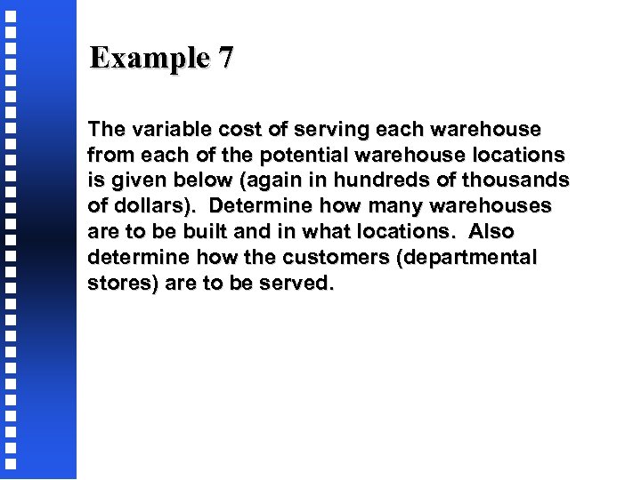 Example 7 The variable cost of serving each warehouse from each of the potential warehouse locations is given below (again in hundreds of thousands of dollars). Determine how many warehouses are to be built and in what locations. Also determine how the customers (departmental stores) are to be served.
