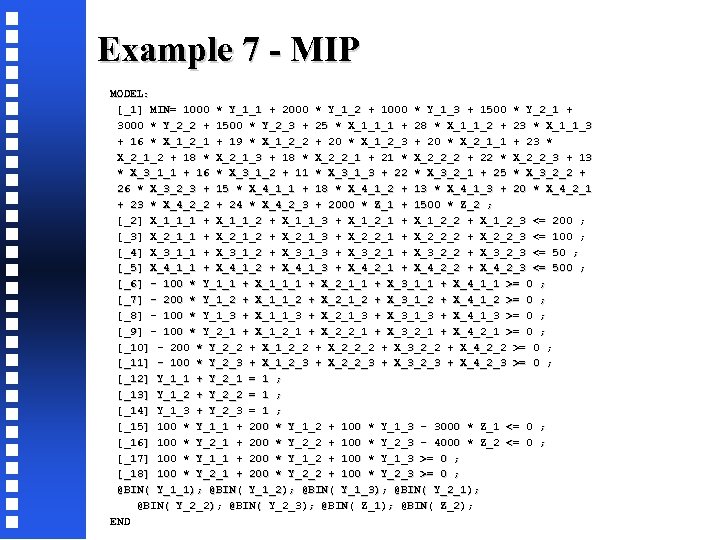 Example 7 – Master Problem MODEL: [_1] MIN= Z; [_2] Z >= -1000 + 2000 * Y_2_1 + 4600 * Y_2_2 + 2400 * Y_2_3 + 1000 * Y_1_1 + 2000 * Y_1_2 + 1000 * Y_1_3 + 1500 * Y_2_1 + 3000 * Y_2_2 + 1500 * Y_2_3 + 2000 * Z_1 + 1500 * Z_2 ; [_4] - 100 * Y_1_1 + X_1_1_1 + X_2_1_1 + X_3_1_1 + X_4_1_1 >= 0 ; [_5] - 200 * Y_1_2 + X_1_1_2 + X_2_1_2 + X_3_1_2 + X_4_1_2 >= 0 ; [_6] - 100 * Y_1_3 + X_1_1_3 + X_2_1_3 + X_3_1_3 + X_4_1_3 >= 0 ; [_7] - 100 * Y_2_1 + X_1_2_1 + X_2_2_1 + X_3_2_1 + X_4_2_1 >= 0 ; [_8] - 200 * Y_2_2 + X_1_2_2 + X_2_2_2 + X_3_2_2 + X_4_2_2 >= 0 ; [_9] - 100 * Y_2_3 + X_1_2_3 + X_2_2_3 + X_3_2_3 + X_4_2_3 >= 0 ; [_10] Y_1_1 + Y_2_1 = 1 ; [_11] Y_1_2 + Y_2_2 = 1 ; [_12] Y_1_3 + Y_2_3 = 1 ; [_13] 100 * Y_1_1 + 200 * Y_1_2 + 100 * Y_1_3 - 3000 * Z_1 <= 0 ; [_14] 100 * Y_2_1 + 200 * Y_2_2 + 100 * Y_2_3 - 4000 * Z_2 <= 0 ; [_15] 100 * Y_1_1 + 200 * Y_1_2 + 100 * Y_1_3 >= 0 ; [_16] 100 * Y_2_1 + 200 * Y_2_2 + 100 * Y_2_3 >= 0 ; @BIN( Y_1_1); @BIN( Y_1_2); @BIN( Y_1_3); @BIN( Y_2_1); @BIN( Y_2_2); @BIN( Y_2_3); @BIN( Z_1); @BIN( Z_2); END