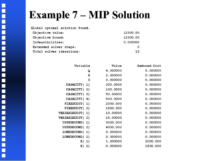 Example 7 – MIP Solution Global optimal solution found. Objective value: 12300. 00 Objective bound: 12300. 00 Infeasibilities: 0. 000000 Extended solver steps: 0 Total solver iterations: 13 Variable Value Reduced Cost Q 4. 000000 0. 000000 R 2. 000000 0. 000000 S 3. 000000 0. 000000 CAPACITY( 1) 200. 0000 0. 000000 CAPACITY( 2) 100. 0000 0. 000000 CAPACITY( 3) 50. 00000 0. 000000 CAPACITY( 4) 500. 0000 0. 000000 FIXEDCOST( 1) 2000. 000 0. 000000 FIXEDCOST( 2) 1500. 000 0. 000000 VARIABLECOST( 1) 10. 00000 0. 000000 VARIABLECOST( 2) 15. 00000 0. 000000 UPPERBOUND( 1) 3000. 000 0. 000000 UPPERBOUND( 2) 4000. 000 0. 000000 LOWERBOUND( 1) 0. 000000 LOWERBOUND( 2) 0. 000000 Z( 1) 1. 000000 2000. 000 Z( 2) 0. 000000 1500. 000