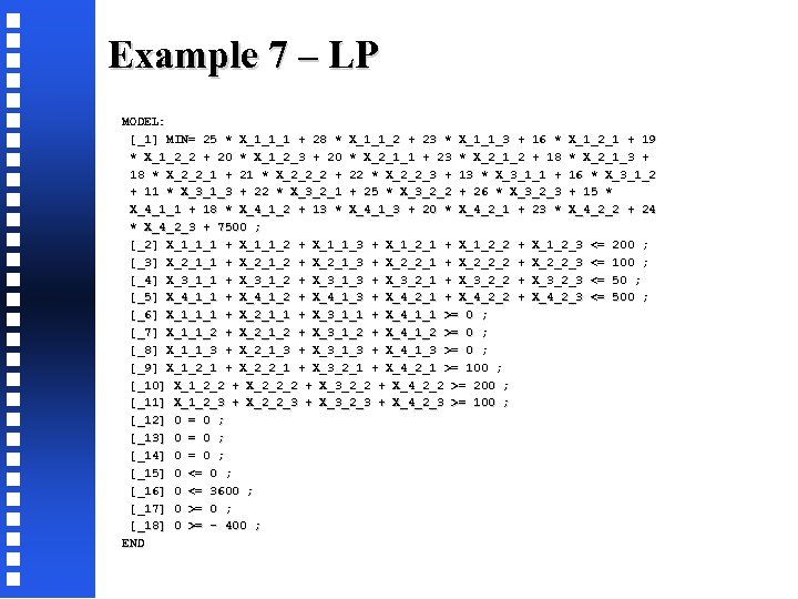 Example 7 – LP MODEL: [_1] MIN= 25 * X_1_1_1 + 28 * X_1_1_2 + 23 * X_1_1_3 + 16 * X_1_2_1 + 19 * X_1_2_2 + 20 * X_1_2_3 + 20 * X_2_1_1 + 23 * X_2_1_2 + 18 * X_2_1_3 + 18 * X_2_2_1 + 21 * X_2_2_2 + 22 * X_2_2_3 + 13 * X_3_1_1 + 16 * X_3_1_2 + 11 * X_3_1_3 + 22 * X_3_2_1 + 25 * X_3_2_2 + 26 * X_3_2_3 + 15 * X_4_1_1 + 18 * X_4_1_2 + 13 * X_4_1_3 + 20 * X_4_2_1 + 23 * X_4_2_2 + 24 * X_4_2_3 + 7500 ; [_2] X_1_1_1 + X_1_1_2 + X_1_1_3 + X_1_2_1 + X_1_2_2 + X_1_2_3 <= 200 ; [_3] X_2_1_1 + X_2_1_2 + X_2_1_3 + X_2_2_1 + X_2_2_2 + X_2_2_3 <= 100 ; [_4] X_3_1_1 + X_3_1_2 + X_3_1_3 + X_3_2_1 + X_3_2_2 + X_3_2_3 <= 50 ; [_5] X_4_1_1 + X_4_1_2 + X_4_1_3 + X_4_2_1 + X_4_2_2 + X_4_2_3 <= 500 ; [_6] X_1_1_1 + X_2_1_1 + X_3_1_1 + X_4_1_1 >= 0 ; [_7] X_1_1_2 + X_2_1_2 + X_3_1_2 + X_4_1_2 >= 0 ; [_8] X_1_1_3 + X_2_1_3 + X_3_1_3 + X_4_1_3 >= 0 ; [_9] X_1_2_1 + X_2_2_1 + X_3_2_1 + X_4_2_1 >= 100 ; [_10] X_1_2_2 + X_2_2_2 + X_3_2_2 + X_4_2_2 >= 200 ; [_11] X_1_2_3 + X_2_2_3 + X_3_2_3 + X_4_2_3 >= 100 ; [_12] 0 = 0 ; [_13] 0 = 0 ; [_14] 0 = 0 ; [_15] 0 <= 0 ; [_16] 0 <= 3600 ; [_17] 0 >= 0 ; [_18] 0 >= - 400 ; END