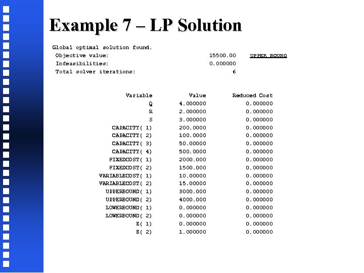 Example 7 – LP Solution Global optimal solution found. Objective value: 15500. 00 UPPER BOUND Infeasibilities: 0. 000000 Total solver iterations: 6 Variable Value Reduced Cost Q 4. 000000 0. 000000 R 2. 000000 0. 000000 S 3. 000000 0. 000000 CAPACITY( 1) 200. 0000 0. 000000 CAPACITY( 2) 100. 0000 0. 000000 CAPACITY( 3) 50. 00000 0. 000000 CAPACITY( 4) 500. 0000 0. 000000 FIXEDCOST( 1) 2000. 000 0. 000000 FIXEDCOST( 2) 1500. 000 0. 000000 VARIABLECOST( 1) 10. 00000 0. 000000 VARIABLECOST( 2) 15. 00000 0. 000000 UPPERBOUND( 1) 3000. 000 0. 000000 UPPERBOUND( 2) 4000. 000 0. 000000 LOWERBOUND( 1) 0. 000000 LOWERBOUND( 2) 0. 000000 Z( 1) 0. 000000 Z( 2) 1. 000000 0. 000000