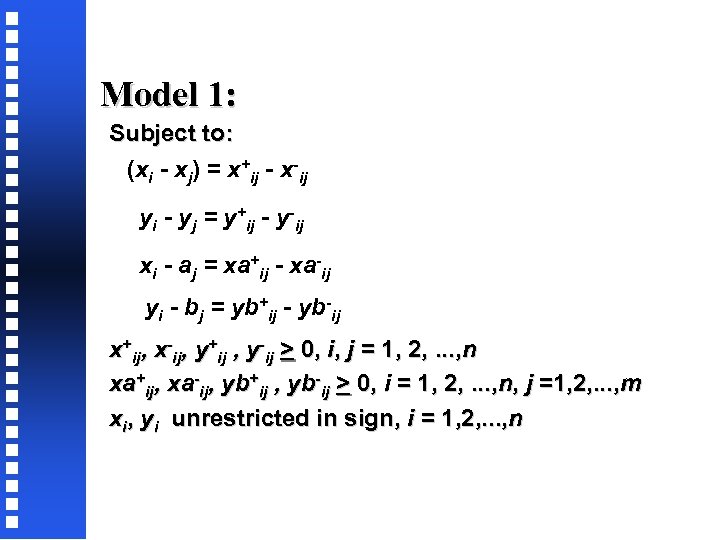Model 1: Subject to: (xi - xj) = x+ij - x-ij yi - yj = y+ij - y-ij xi - aj = xa+ij - xa-ij yi - bj = yb+ij - yb-ij x+ij, x-ij, y+ij , y-ij > 0, i, j = 1, 2, . . . , n xa+ij, xa-ij, yb+ij , yb-ij > 0, i = 1, 2, . . . , n, j =1, 2, . . . , m xi, yi unrestricted in sign, i = 1, 2, . . . , n