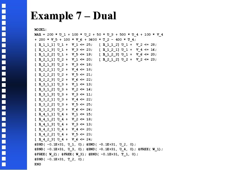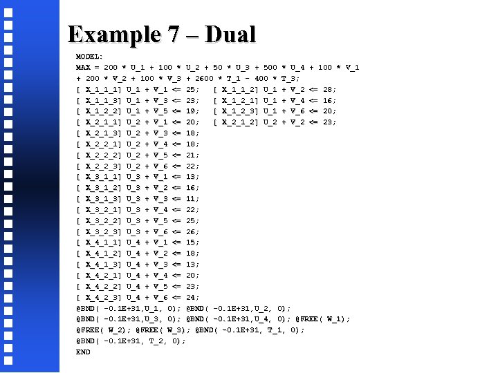 Example 7 – Dual MODEL: MAX = 200 * U_1 + 100 * U_2 + 50 * U_3 + 500 * U_4 + 100 * V_1 + 200 * V_2 + 100 * V_3 + 2600 * T_1 - 400 * T_3; [ X_1_1_1] U_1 + V_1 <= 25; [ X_1_1_2] U_1 + V_2 <= 28; [ X_1_1_3] U_1 + V_3 <= 23; [ X_1_2_1] U_1 + V_4 <= 16; [ X_1_2_2] U_1 + V_5 <= 19; [ X_1_2_3] U_1 + V_6 <= 20; [ X_2_1_1] U_2 + V_1 <= 20; [ X_2_1_2] U_2 + V_2 <= 23; [ X_2_1_3] U_2 + V_3 <= 18; [ X_2_2_1] U_2 + V_4 <= 18; [ X_2_2_2] U_2 + V_5 <= 21; [ X_2_2_3] U_2 + V_6 <= 22; [ X_3_1_1] U_3 + V_1 <= 13; [ X_3_1_2] U_3 + V_2 <= 16; [ X_3_1_3] U_3 + V_3 <= 11; [ X_3_2_1] U_3 + V_4 <= 22; [ X_3_2_2] U_3 + V_5 <= 25; [ X_3_2_3] U_3 + V_6 <= 26; [ X_4_1_1] U_4 + V_1 <= 15; [ X_4_1_2] U_4 + V_2 <= 18; [ X_4_1_3] U_4 + V_3 <= 13; [ X_4_2_1] U_4 + V_4 <= 20; [ X_4_2_2] U_4 + V_5 <= 23; [ X_4_2_3] U_4 + V_6 <= 24; @BND( -0. 1 E+31, U_1, 0); @BND( -0. 1 E+31, U_2, 0); @BND( -0. 1 E+31, U_3, 0); @BND( -0. 1 E+31, U_4, 0); @FREE( W_1); @FREE( W_2); @FREE( W_3); @BND( -0. 1 E+31, T_1, 0); @BND( -0. 1 E+31, T_2, 0); END