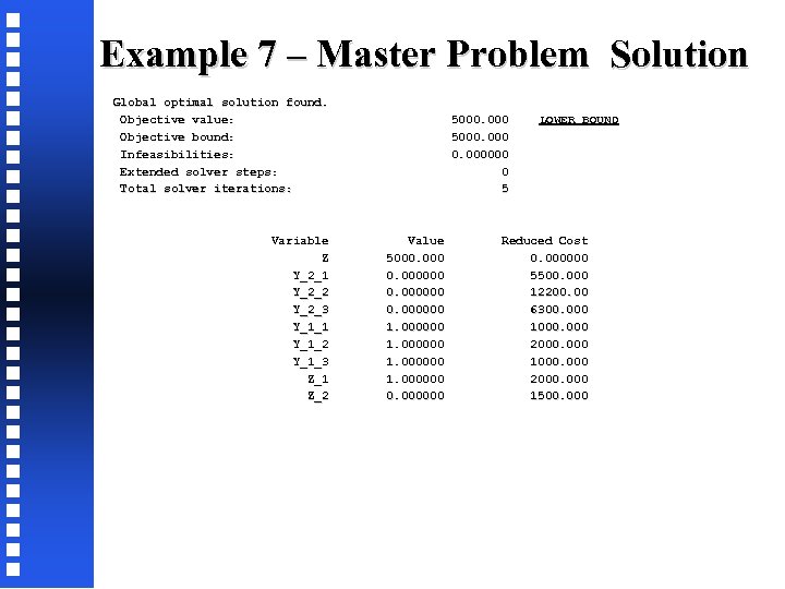 Example 7 – Master Problem Solution Global optimal solution found. Objective value: 5000. 000 LOWER BOUND Objective bound: 5000. 000 Infeasibilities: 0. 000000 Extended solver steps: 0 Total solver iterations: 5 Variable Value Reduced Cost Z 5000. 000 0. 000000 Y_2_1 0. 000000 5500. 000 Y_2_2 0. 000000 12200. 00 Y_2_3 0. 000000 6300. 000 Y_1_1 1. 000000 1000. 000 Y_1_2 1. 000000 2000. 000 Y_1_3 1. 000000 1000. 000 Z_1 1. 000000 2000. 000 Z_2 0. 000000 1500. 000