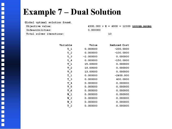Example 7 – Dual Solution Global optimal solution found. Objective value: 6300. 000 + K = 6000 = 12300 UPPPER BOUND Infeasibilities: 0. 000000 Total solver iterations: 10 Variable Value Reduced Cost U_1 0. 000000 -200. 0000 U_2 0. 000000 -100. 0000 U_3 -2. 000000 0. 000000 U_4 0. 000000 -150. 0000 V_1 15. 00000 0. 000000 V_2 18. 00000 0. 000000 V_3 13. 00000 0. 000000 T_1 0. 000000 -2600. 000 T_3 0. 000000 400. 0000 V_4 0. 000000 V_5 0. 000000 V_6 0. 000000 W_1 0. 000000 W_2 0. 000000 W_3 0. 000000 T_2 0. 000000
