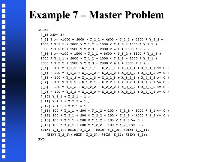 Example 7 – Master Problem MODEL: [_1] MIN= Z; [_2] Z >= -1000 + 2000 * Y_2_1 + 4600 * Y_2_2 + 2400 * Y_2_3 + 1000 * Y_1_1 + 2000 * Y_1_2 + 1000 * Y_1_3 + 1500 * Y_2_1 + 3000 * Y_2_2 + 1500 * Y_2_3 + 2000 * Z_1 + 1500 * Z_2 ; [_3] Z >= -100 + 1500 * Y_1_1 + 3600 * Y_1_2 + 1300 * Y_1_3 + 1000 * Y_1_1 + 2000 * Y_1_2 + 1000 * Y_1_3 + 1500 * Y_2_1 + 3000 * Y_2_2 + 1500 * Y_2_3 + 2000 * Z_1 + 1500 * Z_2 ; [_4] - 100 * Y_1_1 + X_1_1_1 + X_2_1_1 + X_3_1_1 + X_4_1_1 >= 0 ; [_5] - 200 * Y_1_2 + X_1_1_2 + X_2_1_2 + X_3_1_2 + X_4_1_2 >= 0 ; [_6] - 100 * Y_1_3 + X_1_1_3 + X_2_1_3 + X_3_1_3 + X_4_1_3 >= 0 ; [_7] - 100 * Y_2_1 + X_1_2_1 + X_2_2_1 + X_3_2_1 + X_4_2_1 >= 0 ; [_8] - 200 * Y_2_2 + X_1_2_2 + X_2_2_2 + X_3_2_2 + X_4_2_2 >= 0 ; [_9] - 100 * Y_2_3 + X_1_2_3 + X_2_2_3 + X_3_2_3 + X_4_2_3 >= 0 ; [_10] Y_1_1 + Y_2_1 = 1 ; [_11] Y_1_2 + Y_2_2 = 1 ; [_12] Y_1_3 + Y_2_3 = 1 ; [_13] 100 * Y_1_1 + 200 * Y_1_2 + 100 * Y_1_3 - 3000 * Z_1 <= 0 ; [_14] 100 * Y_2_1 + 200 * Y_2_2 + 100 * Y_2_3 - 4000 * Z_2 <= 0 ; [_15] 100 * Y_1_1 + 200 * Y_1_2 + 100 * Y_1_3 >= 0 ; [_16] 100 * Y_2_1 + 200 * Y_2_2 + 100 * Y_2_3 >= 0 ; @BIN( Y_1_1); @BIN( Y_1_2); @BIN( Y_1_3); @BIN( Y_2_1); @BIN( Y_2_2); @BIN( Y_2_3); @BIN( Z_1); @BIN( Z_2); END