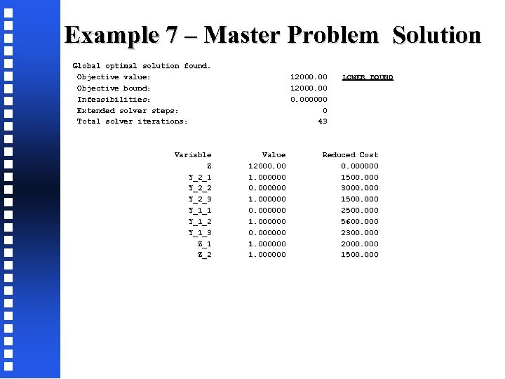 Example 7 – Master Problem Solution Global optimal solution found. Objective value: 12000. 00 LOWER BOUND Objective bound: 12000. 00 Infeasibilities: 0. 000000 Extended solver steps: 0 Total solver iterations: 43 Variable Value Reduced Cost Z 12000. 00 0. 000000 Y_2_1 1. 000000 1500. 000 Y_2_2 0. 000000 3000. 000 Y_2_3 1. 000000 1500. 000 Y_1_1 0. 000000 2500. 000 Y_1_2 1. 000000 5600. 000 Y_1_3 0. 000000 2300. 000 Z_1 1. 000000 2000. 000 Z_2 1. 000000 1500. 000