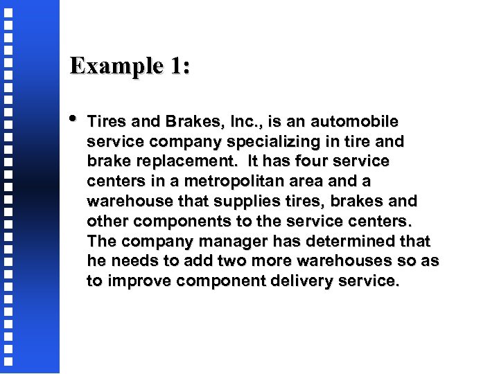 Example 1: • Tires and Brakes, Inc. , is an automobile service company specializing in tire and brake replacement. It has four service centers in a metropolitan area and a warehouse that supplies tires, brakes and other components to the service centers. The company manager has determined that he needs to add two more warehouses so as to improve component delivery service.
