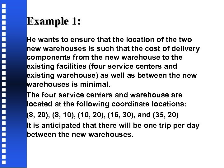 Example 1: He wants to ensure that the location of the two new warehouses is such that the cost of delivery components from the new warehouse to the existing facilities (four service centers and existing warehouse) as well as between the new warehouses is minimal. The four service centers and warehouse are located at the following coordinate locations: (8, 20), (8, 10), (10, 20), (16, 30), and (35, 20) It is anticipated that there will be one trip per day between the new warehouses.