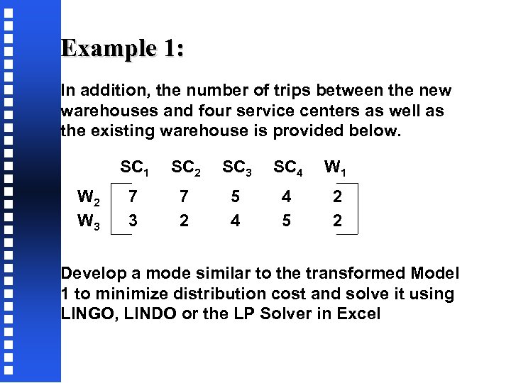 Example 1: In addition, the number of trips between the new warehouses and four service centers as well as the existing warehouse is provided below. SC 1 W 2 W 3 SC 2 SC 3 SC 4 W 1 7 3 7 2 5 4 4 5 2 2 Develop a mode similar to the transformed Model 1 to minimize distribution cost and solve it using LINGO, LINDO or the LP Solver in Excel