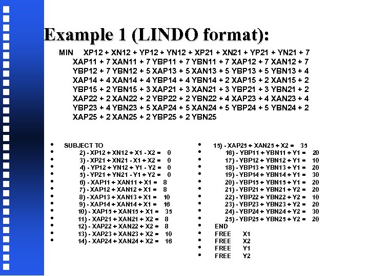 Example 1 (LINDO format): MIN XP 12 + XN 12 + YP 12 + YN 12 + XP 21 + XN 21 + YP 21 + YN 21 + 7 XAP 11 + 7 XAN 11 + 7 YBP 11 + 7 YBN 11 + 7 XAP 12 + 7 XAN 12 + 7 YBP 12 + 7 YBN 12 + 5 XAP 13 + 5 XAN 13 + 5 YBP 13 + 5 YBN 13 + 4 XAP 14 + 4 XAN 14 + 4 YBP 14 + 4 YBN 14 + 2 XAP 15 + 2 XAN 15 + 2 YBP 15 + 2 YBN 15 + 3 XAP 21 + 3 XAN 21 + 3 YBP 21 + 3 YBN 21 + 2 XAP 22 + 2 XAN 22 + 2 YBP 22 + 2 YBN 22 + 4 XAP 23 + 4 XAN 23 + 4 YBP 23 + 4 YBN 23 + 5 XAP 24 + 5 XAN 24 + 5 YBP 24 + 5 YBN 24 + 2 XAP 25 + 2 XAN 25 + 2 YBP 25 + 2 YBN 25 • • • • SUBJECT TO 2) - XP 12 + XN 12 + X 1 - X 2 = 3) - XP 21 + XN 21 - X 1 + X 2 = 4) - YP 12 + YN 12 + Y 1 - Y 2 = 5) - YP 21 + YN 21 - Y 1 + Y 2 = 6) - XAP 11 + XAN 11 + X 1 = 7) - XAP 12 + XAN 12 + X 1 = 8) - XAP 13 + XAN 13 + X 1 = 9) - XAP 14 + XAN 14 + X 1 = 10) - XAP 15 + XAN 15 + X 1 = 11) - XAP 21 + XAN 21 + X 2 = 12) - XAP 22 + XAN 22 + X 2 = 13) - XAP 23 + XAN 23 + X 2 = 14) - XAP 24 + XAN 24 + X 2 = 0 0 8 8 10 16 35 8 8 10 16 • • • • 15) - XAP 25 + XAN 25 + X 2 = 35 16) - YBP 11 + YBN 11 + Y 1 = 17) - YBP 12 + YBN 12 + Y 1 = 18) - YBP 13 + YBN 13 + Y 1 = 19) - YBP 14 + YBN 14 + Y 1 = 20) - YBP 15 + YBN 15 + Y 1 = 21) - YBP 21 + YBN 21 + Y 2 = 22) - YBP 22 + YBN 22 + Y 2 = 23) - YBP 23 + YBN 23 + Y 2 = 24) - YBP 24 + YBN 24 + Y 2 = 25) - YBP 25 + YBN 25 + Y 2 = END FREE X 1 FREE X 2 FREE Y 1 FREE Y 2 20 10 20 30 20