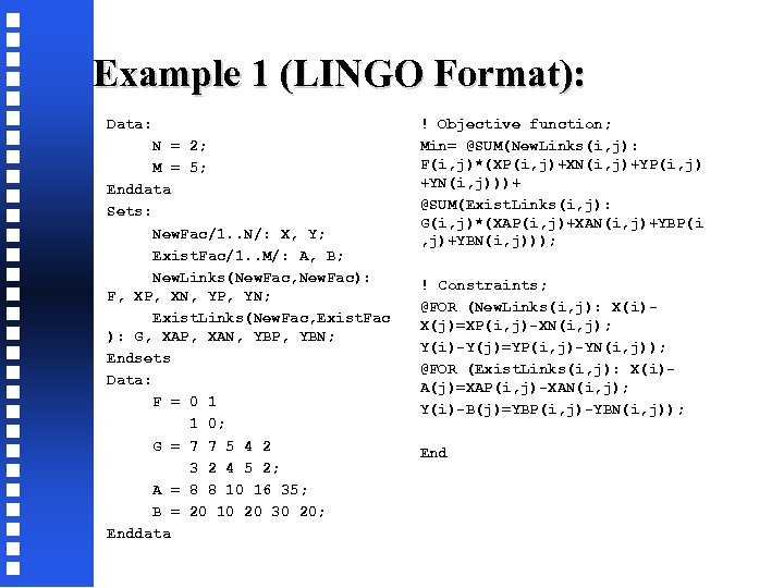 Example 1 (LINGO Format): Data: N = 2; M = 5; Enddata Sets: New. Fac/1. . N/: X, Y; Exist. Fac/1. . M/: A, B; New. Links(New. Fac, New. Fac): F, XP, XN, YP, YN; Exist. Links(New. Fac, Exist. Fac ): G, XAP, XAN, YBP, YBN; Endsets Data: F = 0 1 1 0; G = 7 7 5 4 2 3 2 4 5 2; A = 8 8 10 16 35; B = 20 10 20 30 20; Enddata ! Objective function; Min= @SUM(New. Links(i, j): F(i, j)*(XP(i, j)+XN(i, j)+YP(i, j) +YN(i, j)))+ @SUM(Exist. Links(i, j): G(i, j)*(XAP(i, j)+XAN(i, j)+YBP(i , j)+YBN(i, j))); ! Constraints; @FOR (New. Links(i, j): X(i)X(j)=XP(i, j)-XN(i, j); Y(i)-Y(j)=YP(i, j)-YN(i, j)); @FOR (Exist. Links(i, j): X(i)A(j)=XAP(i, j)-XAN(i, j); Y(i)-B(j)=YBP(i, j)-YBN(i, j)); End