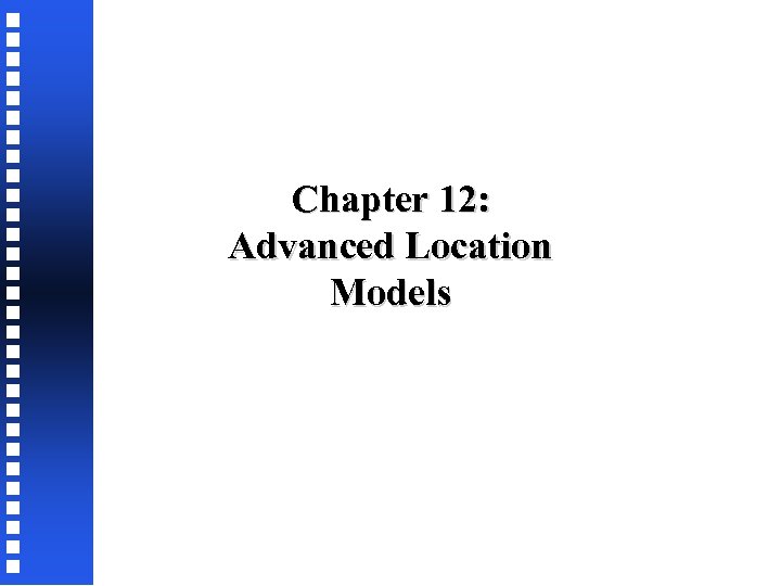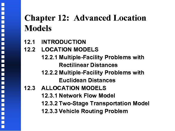 Chapter 12: Advanced Location Models 12. 1 12. 2 12. 3 INTRODUCTION LOCATION MODELS 12. 2. 1 Multiple-Facility Problems with Rectilinear Distances 12. 2. 2 Multiple-Facility Problems with Euclidean Distances ALLOCATION MODELS 12. 3. 1 Network Flow Model 12. 3. 2 Two-Stage Transportation Model 12. 3. 3 Vehicle Routing Problem
