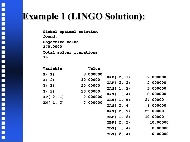 Example 1 (LINGO Solution): Global optimal solution found. Objective value: 370. 0000 Total solver iterations: 16 Variable Value X( 1) 8. 000000 XAP( 2, 1) 2. 000000 X( 2) 10. 00000 XAP( 2, 2) 2. 000000 Y( 1) 20. 00000 XAN( 1, 3) 2. 000000 Y( 2) 20. 00000 XAN( 1, 4) 8. 000000 XP( 2, 1) 2. 000000 XAN( 1, 5) 27. 00000 XN( 1, 2) 2. 000000 XAN( 2, 4 6. 000000 XAN( 2, 5) 25. 00000 YBP( 1, 2) 10. 00000 YBP( 2, 2) 10. 00000 YBN( 1, 4) 10. 00000 YBN( 2, 4) 10. 00000