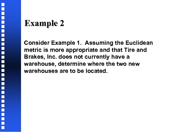 Example 2 Consider Example 1. Assuming the Euclidean metric is more appropriate and that Tire and Brakes, Inc. does not currently have a warehouse, determine where the two new warehouses are to be located.