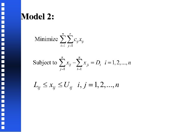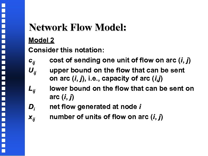 Network Flow Model: Model 2 Consider this notation: cij cost of sending one unit of flow on arc (i, j) Uij upper bound on the flow that can be sent on arc (i, j), i. e. , capacity of arc (i, j) Lij lower bound on the flow that can be sent on arc (i, j) Di net flow generated at node i xij number of units of flow on arc (i, j)