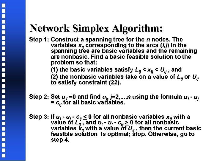 Network Simplex Algorithm: Step 1: Construct a spanning tree for the n nodes. The variables xij corresponding to the arcs (i, j) in the spanning tree are basic variables and the remaining are nonbasic. Find a basic feasible solution to the problem so that: (1) the basic variables satisfy Lij < xij < Uij , and (2) the nonbasic variables take on a value of Lij or Uij to satisfy constraint (22). Step 2: Set u 1 =0 and find uj, j=2, . . . , n using the formula ui - uj = cij for all basic variables. Step 3: If ui - uj - cij < 0 for all nonbasic variables xij with a value of Lij , and ui - uj - cij > 0 for all nonbasic variables xij with a value of Uij , then the current basic feasible solution is optimal; stop. Otherwise, go to step 4.