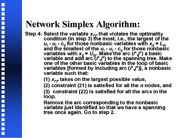 Network Simplex Algorithm: Step 4: Select the variable xi*j* that violates the optimality condition (in step 3) the most, i. e. , the largest of the ui - uj - cij for those nonbasic variables with xij = Lij, and the smallest of the ui - uj - cij for those nonbasic variables with xij = Uij, . Make the arc (i*, j*) a basic variable and add arc (i*, j*) to the spanning tree. Make one of the other basic variables in the loop of basic variables [formed by including arc (i*, j*)], a nonbasic variable such that: (1) xi*j* takes on the largest possible value, (2) constraint (21) is satisfied for all the n nodes, and (3) constraint (22) is satisfied for all the arcs in the loop. Remove the arc corresponding to the nonbasic variable just identified so that we have a spanning tree once again. Go to step 2.