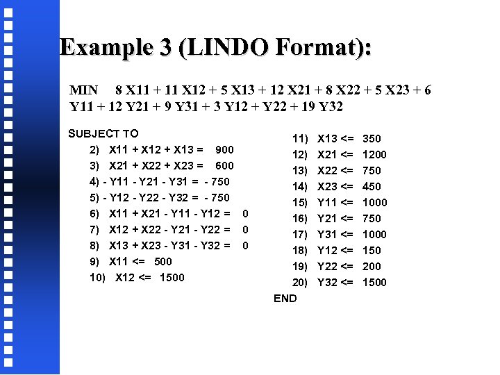 Example 3 (LINDO Format): MIN 8 X 11 + 11 X 12 + 5 X 13 + 12 X 21 + 8 X 22 + 5 X 23 + 6 Y 11 + 12 Y 21 + 9 Y 31 + 3 Y 12 + Y 22 + 19 Y 32 SUBJECT TO 2) X 11 + X 12 + X 13 = 900 3) X 21 + X 22 + X 23 = 600 4) - Y 11 - Y 21 - Y 31 = - 750 5) - Y 12 - Y 22 - Y 32 = - 750 6) X 11 + X 21 - Y 12 = 0 7) X 12 + X 22 - Y 21 - Y 22 = 0 8) X 13 + X 23 - Y 31 - Y 32 = 0 9) X 11 <= 500 10) X 12 <= 1500 11) 12) 13) 14) 15) 16) 17) 18) 19) 20) END X 13 <= X 21 <= X 22 <= X 23 <= Y 11 <= Y 21 <= Y 31 <= Y 12 <= Y 22 <= Y 32 <= 350 1200 750 450 1000 750 1000 150 200 1500