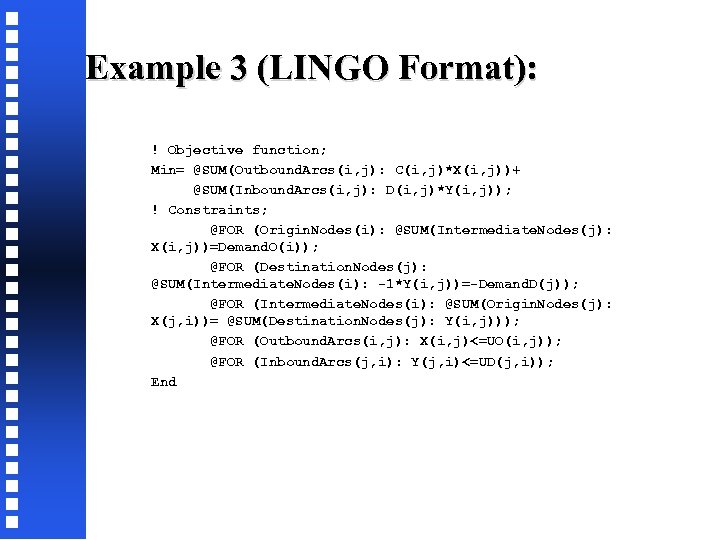 Example 3 (LINGO Format): ! Objective function; Min= @SUM(Outbound. Arcs(i, j): C(i, j)*X(i, j))+ @SUM(Inbound. Arcs(i, j): D(i, j)*Y(i, j)); ! Constraints; @FOR (Origin. Nodes(i): @SUM(Intermediate. Nodes(j): X(i, j))=Demand. O(i)); @FOR (Destination. Nodes(j): @SUM(Intermediate. Nodes(i): -1*Y(i, j))=-Demand. D(j)); @FOR (Intermediate. Nodes(i): @SUM(Origin. Nodes(j): X(j, i))= @SUM(Destination. Nodes(j): Y(i, j))); @FOR (Outbound. Arcs(i, j): X(i, j)<=UO(i, j)); @FOR (Inbound. Arcs(j, i): Y(j, i)<=UD(j, i)); End