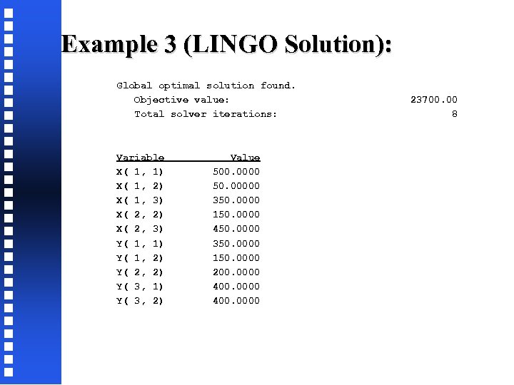 Example 3 (LINGO Solution): Global optimal solution found. Objective value: 23700. 00 Total solver iterations: 8 Variable Value X( 1, 1) 500. 0000 X( 1, 2) 50. 00000 X( 1, 3) 350. 0000 X( 2, 2) 150. 0000 X( 2, 3) 450. 0000 Y( 1, 1) 350. 0000 Y( 1, 2) 150. 0000 Y( 2, 2) 200. 0000 Y( 3, 1) 400. 0000 Y( 3, 2) 400. 0000