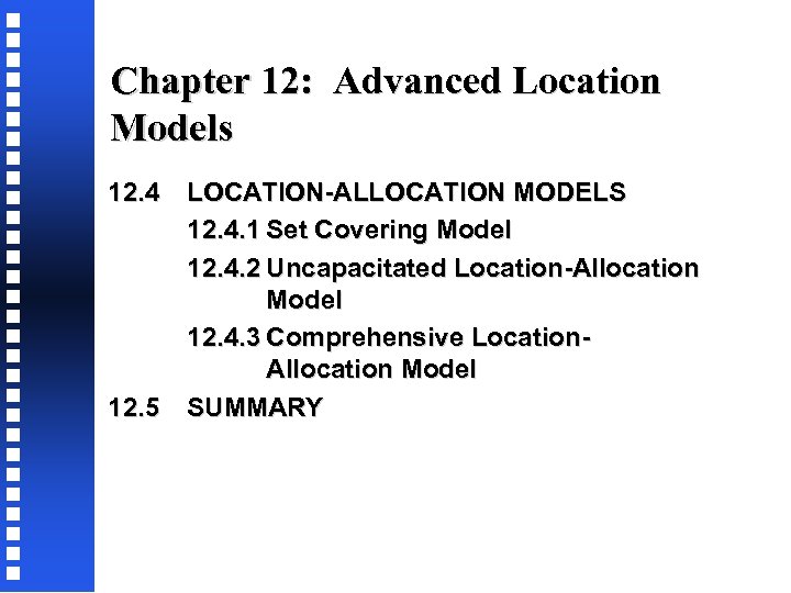 Chapter 12: Advanced Location Models 12. 4 12. 5 LOCATION-ALLOCATION MODELS 12. 4. 1 Set Covering Model 12. 4. 2 Uncapacitated Location-Allocation Model 12. 4. 3 Comprehensive Location. Allocation Model SUMMARY