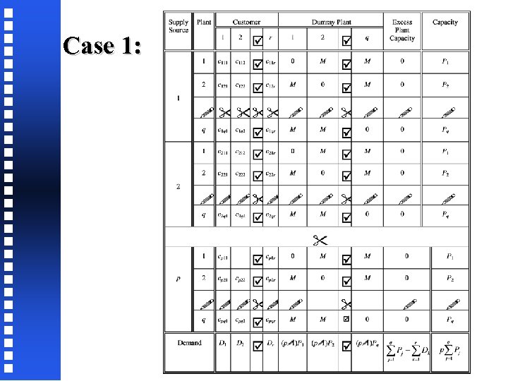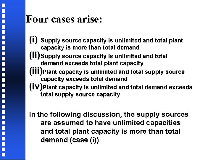 Four cases arise: (i) Supply source capacity is unlimited and total plant capacity is more than total demand (ii) Supply source capacity is unlimited and total demand exceeds total plant capacity (iii)Plant capacity is unlimited and total supply source capacity exceeds total demand (iv)Plant capacity is unlimited and total demand exceeds total supply source capacity In the following discussion, the supply sources are assumed to have unlimited capacities and total plant capacity is more than total demand (case (i))