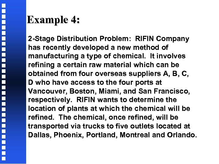 Example 4: 2 -Stage Distribution Problem: RIFIN Company has recently developed a new method of manufacturing a type of chemical. It involves refining a certain raw material which can be obtained from four overseas suppliers A, B, C, D who have access to the four ports at Vancouver, Boston, Miami, and San Francisco, respectively. RIFIN wants to determine the location of plants at which the chemical will be refined. The chemical, once refined, will be transported via trucks to five outlets located at Dallas, Phoenix, Portland, Montreal and Orlando.